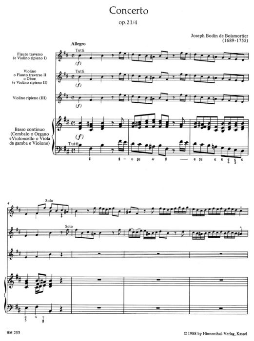 Boismortier Concerto Op.21/4 for 2 Solo Instruments, 3 Violins & Basso continuo (Score & Parts)